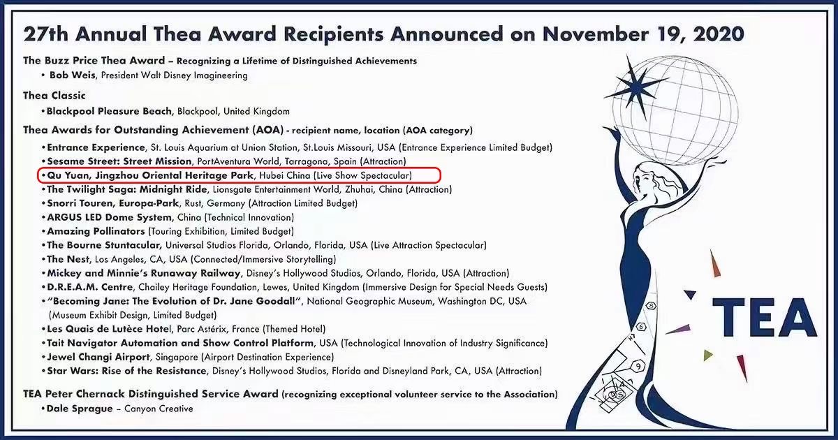美國(guó)當(dāng)?shù)貢r(shí)間11月19日,國(guó)際主題娛樂(lè)協(xié)會(huì)(TEA)公布了第27屆Thea大獎(jiǎng)名單,華強(qiáng)方特集團(tuán)旗下荊州方特東方神畫主題樂(lè)園的大型真人演藝特效劇場(chǎng)項(xiàng)目——《屈原》榮獲2020年度“杰出成就獎(jiǎng)”。據(jù)悉,成立于1991年的主題娛樂(lè)協(xié)會(huì)(ThemedEntertainmentAssociation:TEA)作..
